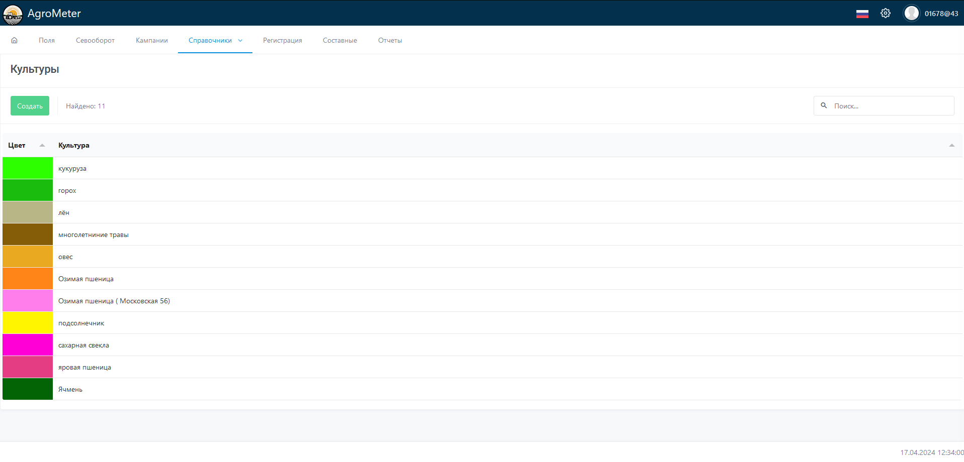 На этой странице приложения создается справочник сельскохозяйственных культур, которые выращиваются на полях. Для работы с культурами выберите одноименный подпункт в пункте Справочники в навигационной панели.
